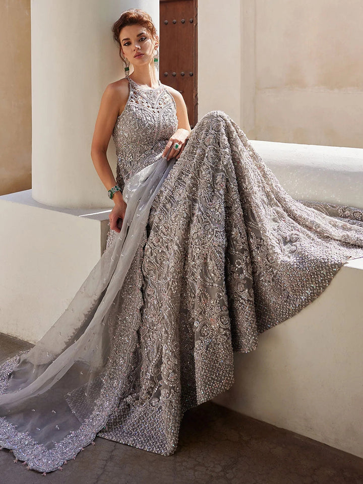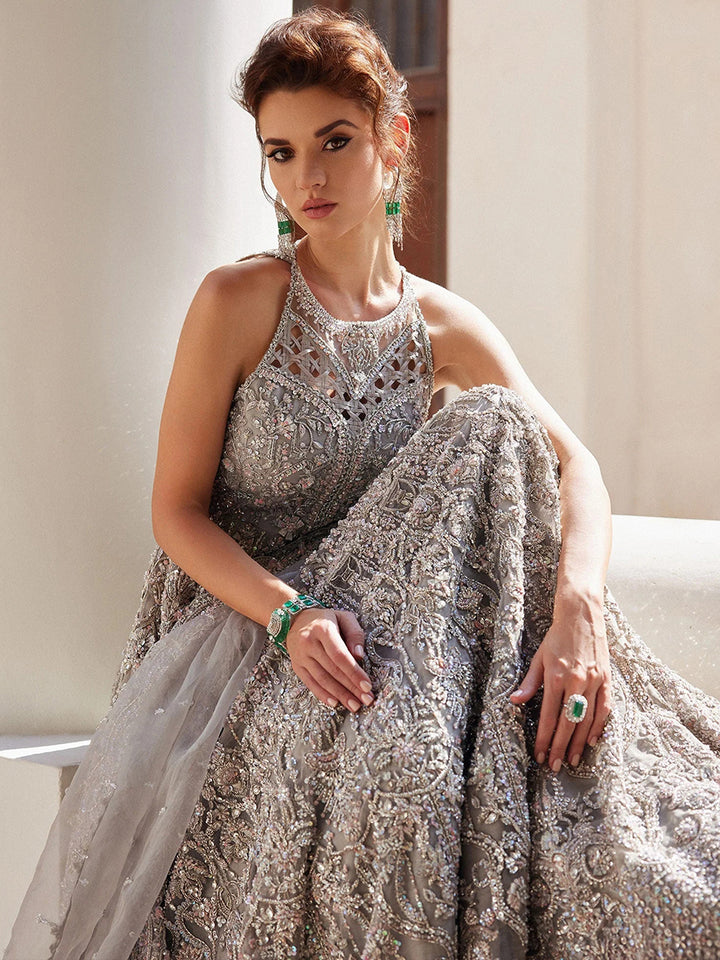 A stunning blend of contemporary sophistication and intricate craftsmanship. This breathtaking grey organza bridal gown features a chic halter neck, creating a structured, graceful silhouette that exudes timeless elegance.