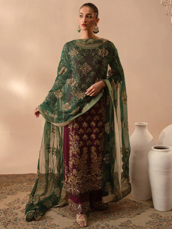 Burgundy Dusk features a meticulously crafted organza net shirt in a rich plum hue.Paired with an emerald, green pure organza dupatta embellished with sequins spray and floral motifs.