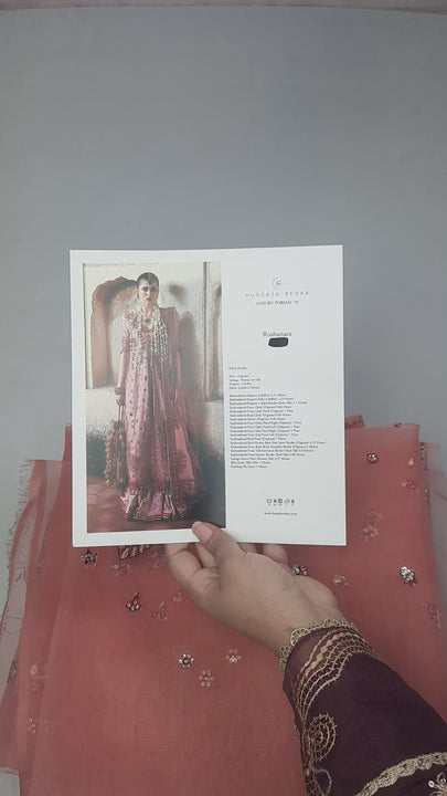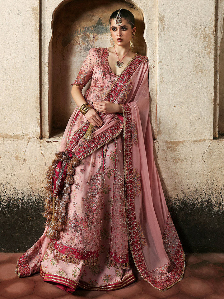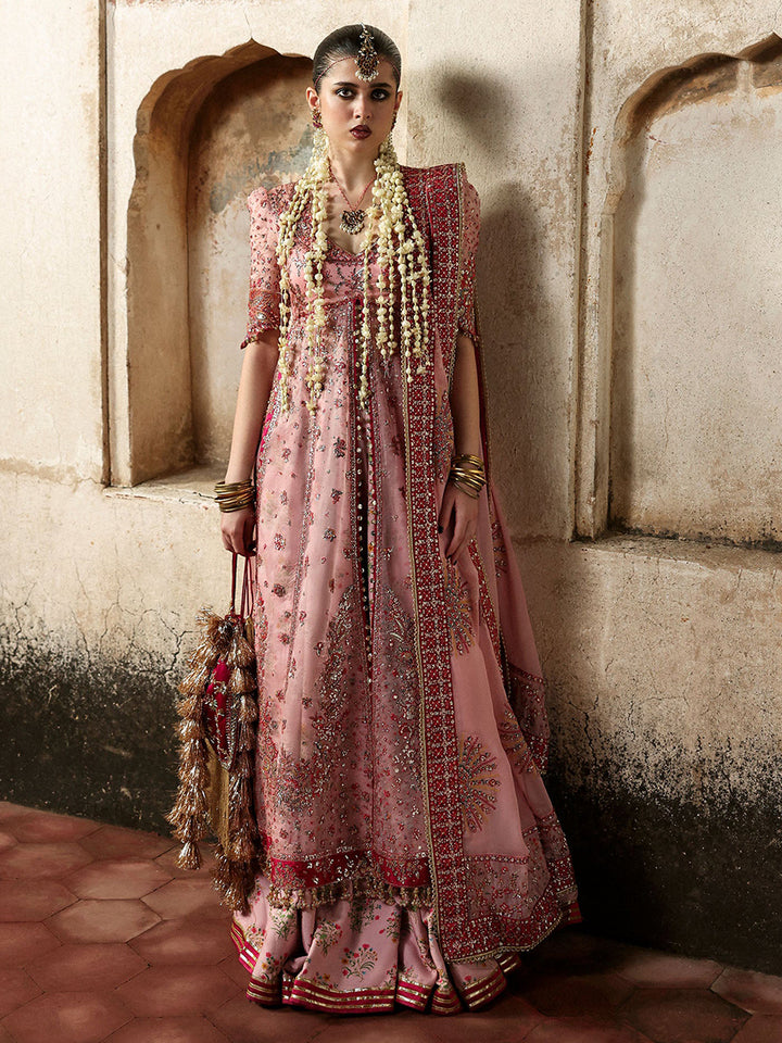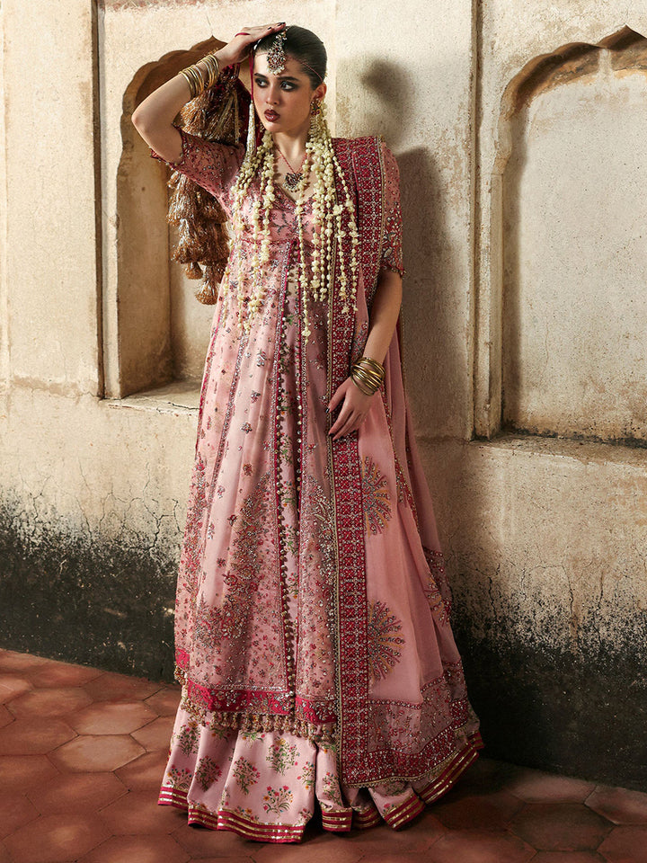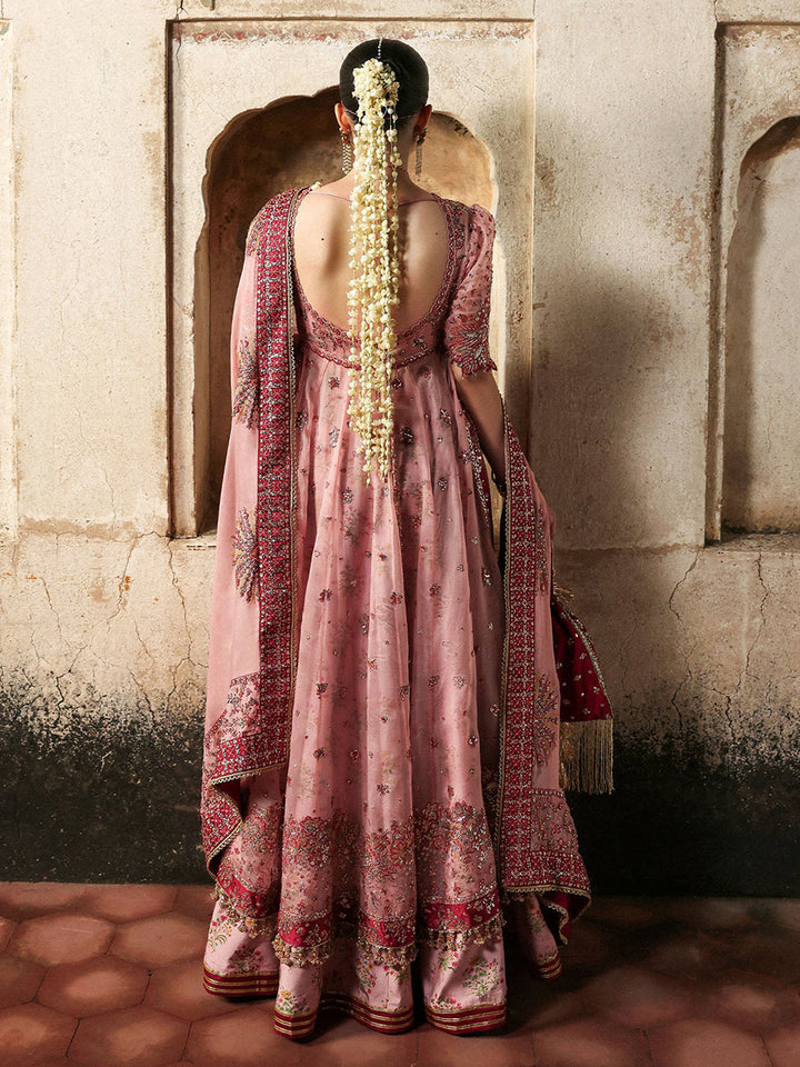 This pink organza shirt with front open pishwas is designed with embroidered panels on front and back, highlighted with embroidered sleeves and daman border that elevate its charm. The chiffon dupatta is detailed with four side fuchsia pink embroidered borders.