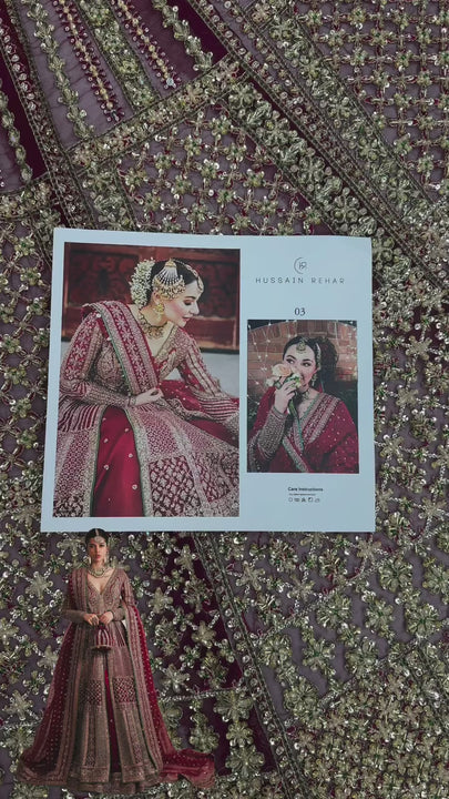 This ravishing bridal outfit is rendered in a beautiful shade of berry red composed on an organza front open peshwas with an intricate and exquisite detailed adda work of sequins, Buggle beads, resham, nakshi and dabka makes truely an artwork.